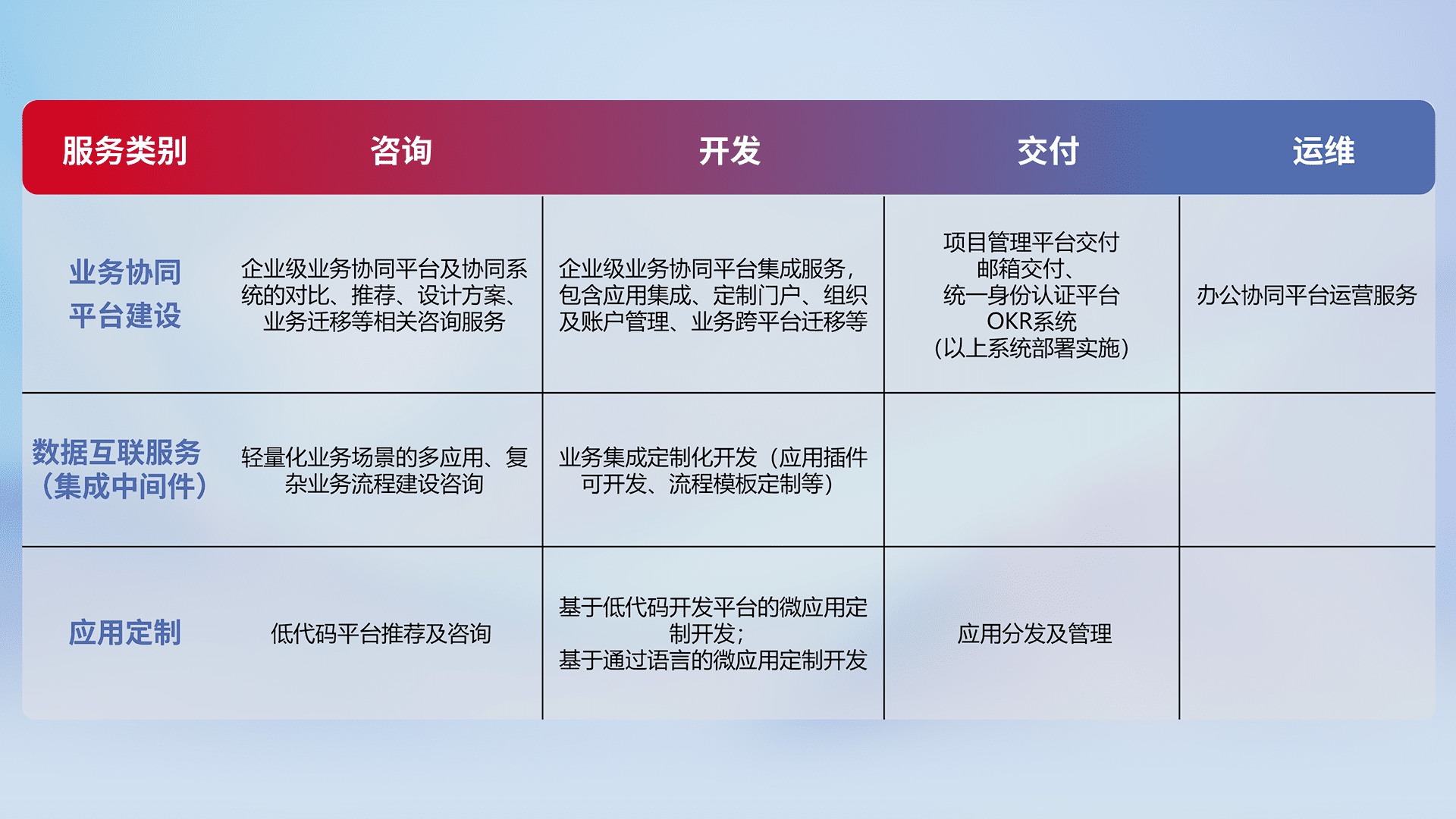 针对钉钉、、、企微、、IDaas等平台级产品提供产品的规划、、、、方案、、、、交付、、、、定制化开发等服务,,实现如统一协同办公、、、、智能客户服务、、、混合会议管理、、、、智能数据查询、、、、等业务场景,,,实现数字化转型。。