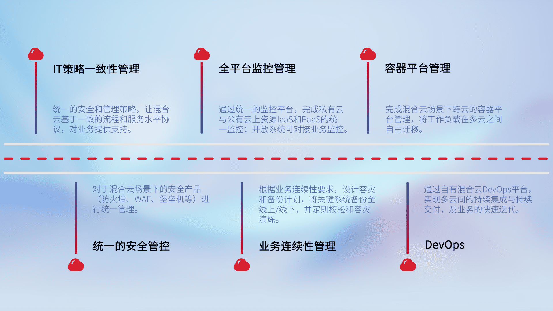 通过多云纳管,,,以统一的资源数据模型把客户的云资源进行抽象和封装,,,进而实现对多云资源的统一操作,,,保障云资源管理的可靠性、、、稳定性与可用性。。量身定制化运维内容,,,,配置、、、、开发运维、、、补丁管理、、、、备份、、、监控、、、、认证和访问管理、、、、审计和日常巡检等,,,保障在用云过程中的可靠度,,,,稳定度以及高可用率。。